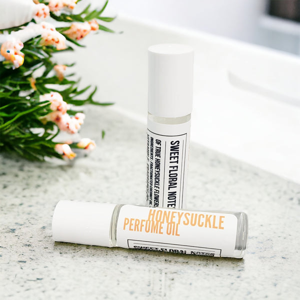 Our Honeysuckle perfume oil is a floral scent bath and body gift perfect for Mother's Day and gifts for women. This sweet honeysuckle roll on perfume oil is a an ideal scent for spring and bridal shower gifts too. Our natural perfume oils are convenient to carry on the go and handmade is small batches for that perfect amount of fragrance you can wear close to your skin.